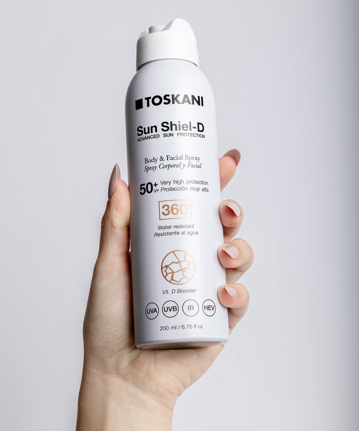 El Sun Shiel-D Body & Face Spray TOSKANI SPF50+ es un protector solar en spray diseñado para ofrecer fotoprotección de amplio espectro contra los rayos UVA y UVB, cuidando tanto el rostro como el cuerpo. Su fórmula ligera y transparente se absorbe rápidamente sin dejar sensación grasa, proporcionando una protección eficaz y cómoda para el día a día o actividades al aire libre.